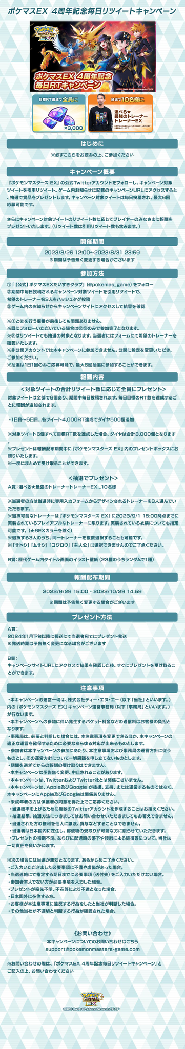 / #ポケマスEX4周年毎日RTキャンペーン 【1日目】 \ 最強のトレーナートレーナーEXやイラスト壁紙をプレゼント🎁 ①@pokemas_game をフォロー ②このツイートを引用RTで希望のトレーナー名3人をハッシュタグ投稿 ③ゲーム内お知らせから抽選結果を確認 詳細 pbs.twimg.com/media/F4L1qq_a… #ポケマスEX