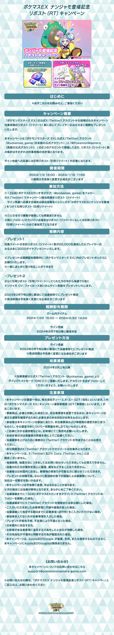 ⚡ナンジャモ登場記念リポストキャンペーン⚡ ①@pokemas_gameをフォロー ②この投稿をリポスト 対象投稿の合計リポスト数が2万達成でダイヤ3000個プレゼント✨ サイン色紙へ応募する場合はハッシュタグ「#ポケマスEXにナンジャモ登場」をつけて引用リポスト! pbs.twimg.com/media/GC-Dx7Wa… #ポケマスEX