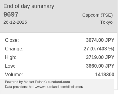 [9697] Capcom (TSE): Close: ¥3674.00 Change: ¥27 (0.74 %) High/Low: ¥3719 /¥3660 Vol: 1418300 #Capcom_IR pulse.euroland.com/i/9697/EOD-251…