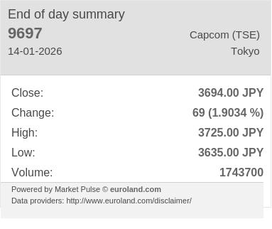 [9697] Capcom (TSE): Close: ¥3694.00 Change: ¥69 (1.90 %) High/Low: ¥3725 /¥3635 Vol: 1743700 #Capcom_IR pulse.euroland.com/i/9697/EOD-260…