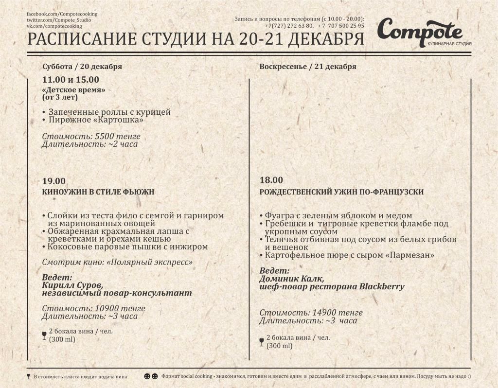 Друзья, осталось 2 места на двухнедельную программу Homechef / "Домашний шеф-повар" в студии Compote. 10 занятий, 5 шефов. Тел 272 63 80.