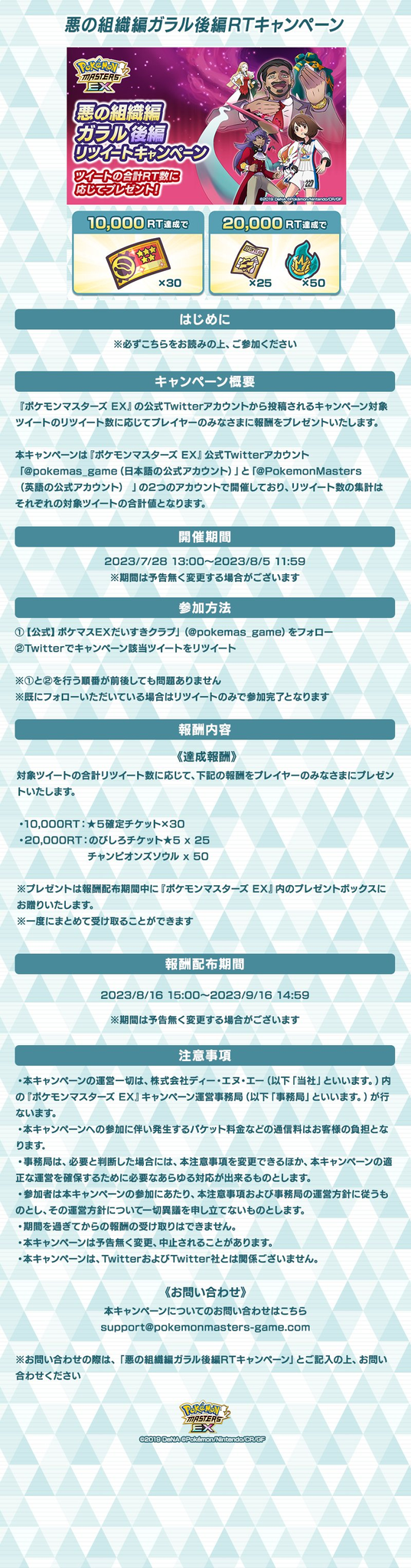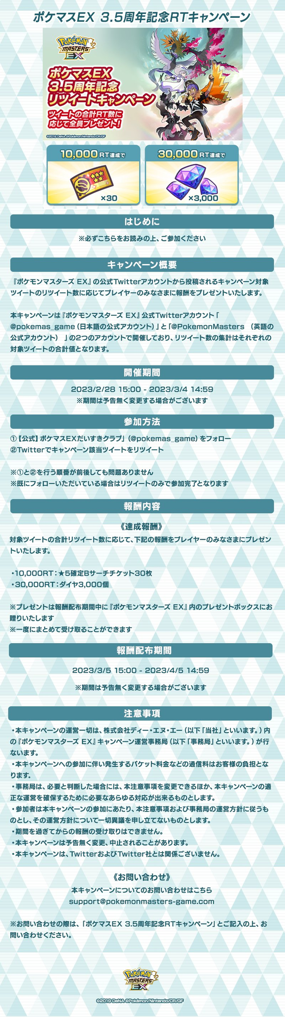 ポケマスEX 3.5周年記念RTキャンペーン! ■参加方法 ① @pokemas_game をフォロー ② このツイートをRT @pokemas_game と @PokemonMasters の対象ツイートの合計RT数に応じて皆様にプレゼント! 詳細 pbs.twimg.com/media/Fp8_UeUa… #ポケマスEX