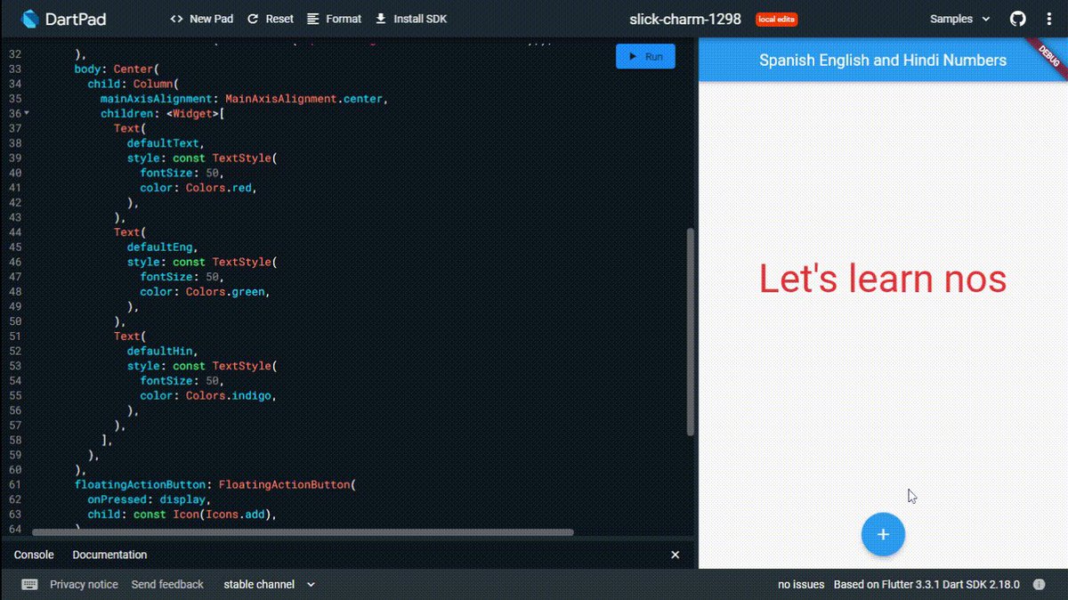 Day 7 : #90DaysofFlutter Spanish number app Let's learn counting #flutter #DartPad #AndroidDev #Apple #iosdev #crossPlatform #100DaysOfCode #dart @imthepk @FlutterDev @IndiaFlutter @googledevs @p_szklarska @dhuma1981 @burhanrashid52 @ibhavikmakwana @pooja_bhaumik @shin_chong