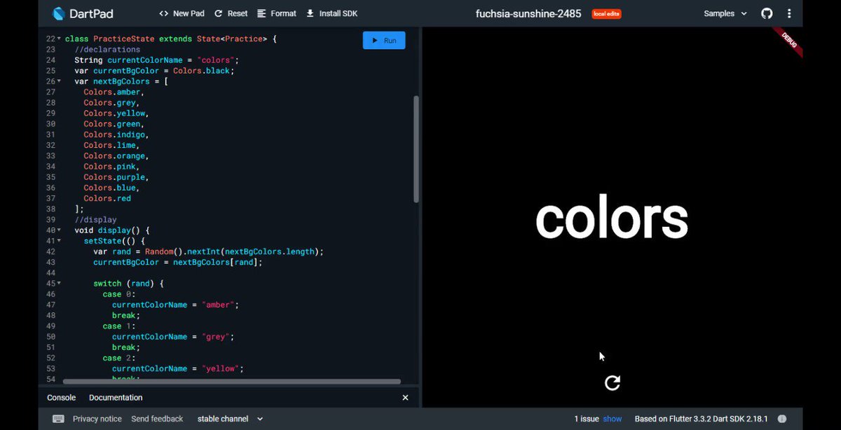 Day 11 : #90DaysofFlutter Random Background Color Changer(upgraded) #flutter #DartPad #AndroidDev #Apple #iosdev #crossPlatform #100DaysOfCode #dart @imthepk @FlutterDev @IndiaFlutter @googledevs @p_szklarska @dhuma1981 @burhanrashid52 @shin_chong