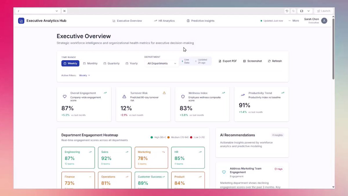 Step 1 – UI Design & Layout Built for leaders who need real-time visibility into team health. The dashboard includes: - Engagement heatmaps - Predictive analytics - Wellness indicators - Trend analysis graphs - HR panels with org-wide insights
