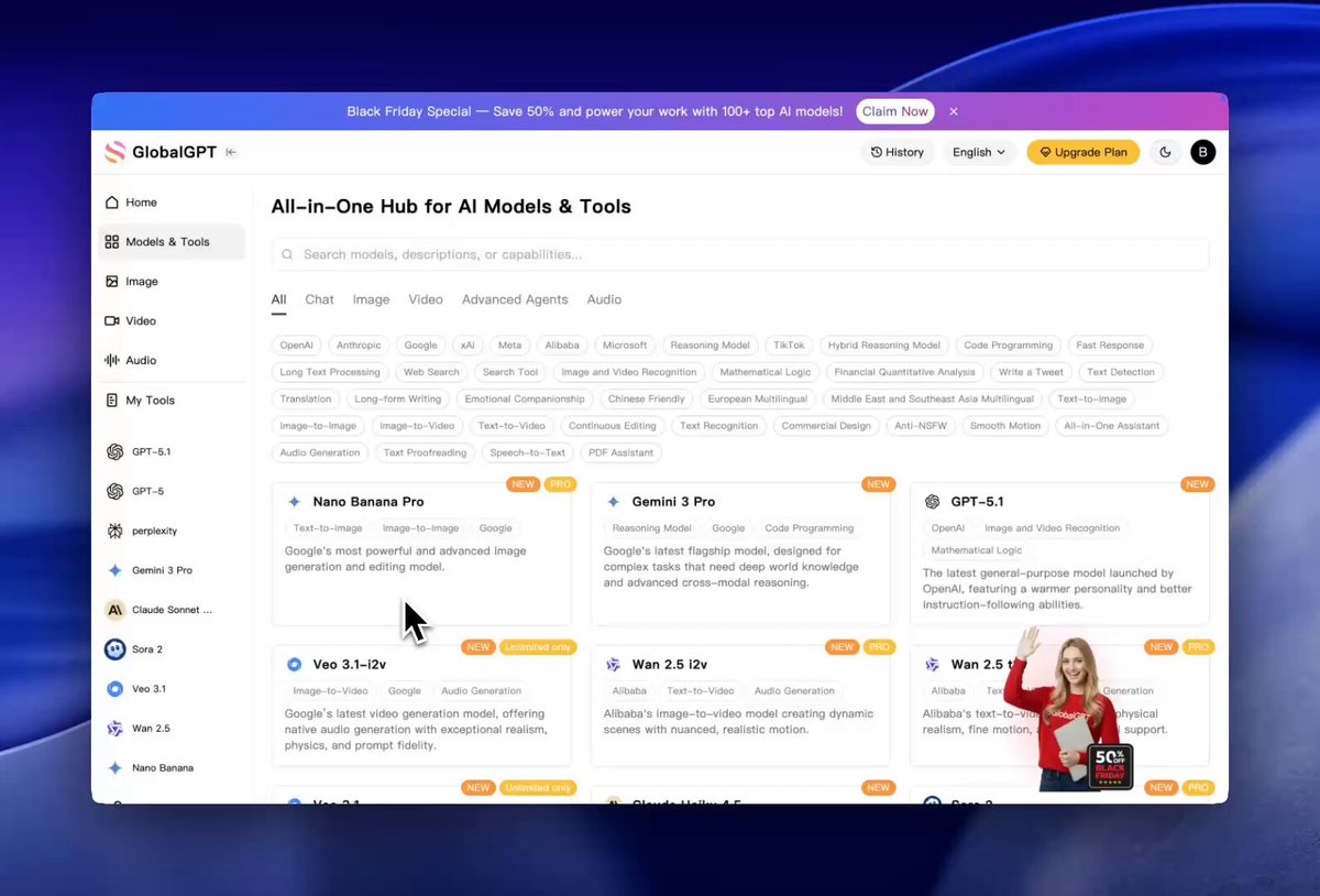 AI BlackFriday Madness is now! → 1 account, no regional restrictions. → Get access to 100+ advanced models — all powered by official APIs. → Work, study, research, create videos, images, reports, and more… → Up to 50% off now, only on GlobalGPT 👉 glbgpt.com/home