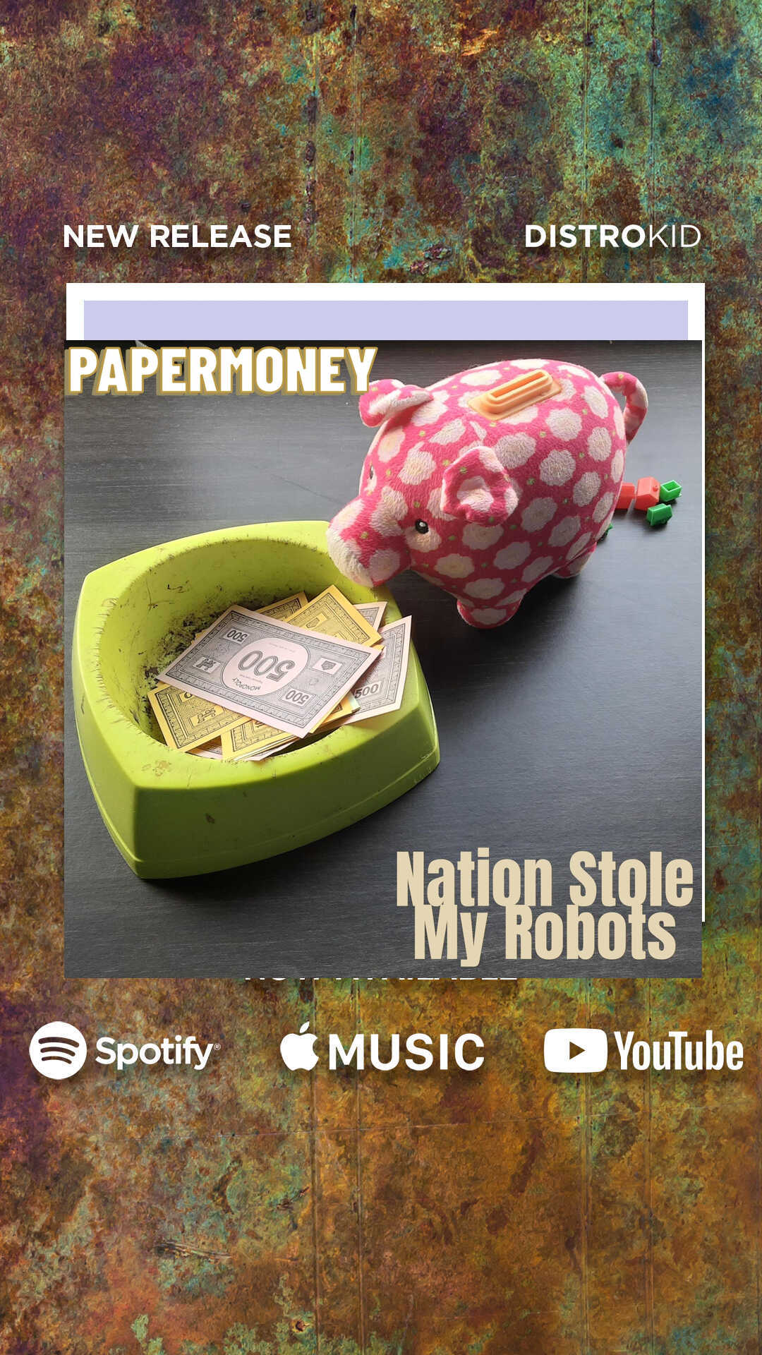 This is Papermoney, my new single and my first solo one for over a year. Bandcamp and Spotify have it already, with others to follow. Tuck in! Bandcamp = nationstolemyrobots.bandcamp.com/track/papermon… distrokid.com/promocards/ima…