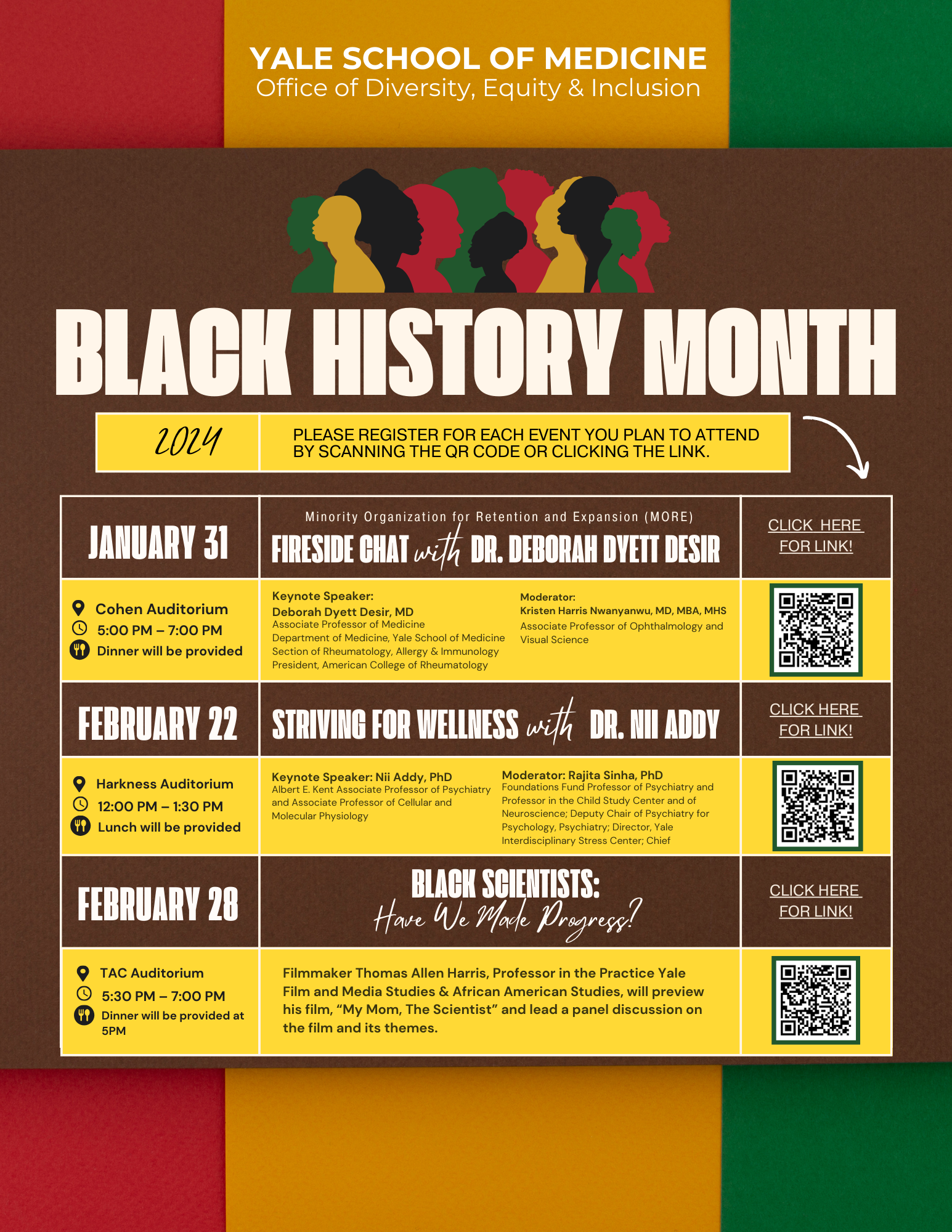 Hello YSM Community, In honor of Black History Month, the YSM Office of Diversity, Equity, and Inclusion cordially invites you to attend three special events. Please click here for additional information and links to register for each event. yalesurvey.ca1.qualtrics.com/WRQualtricsSur…