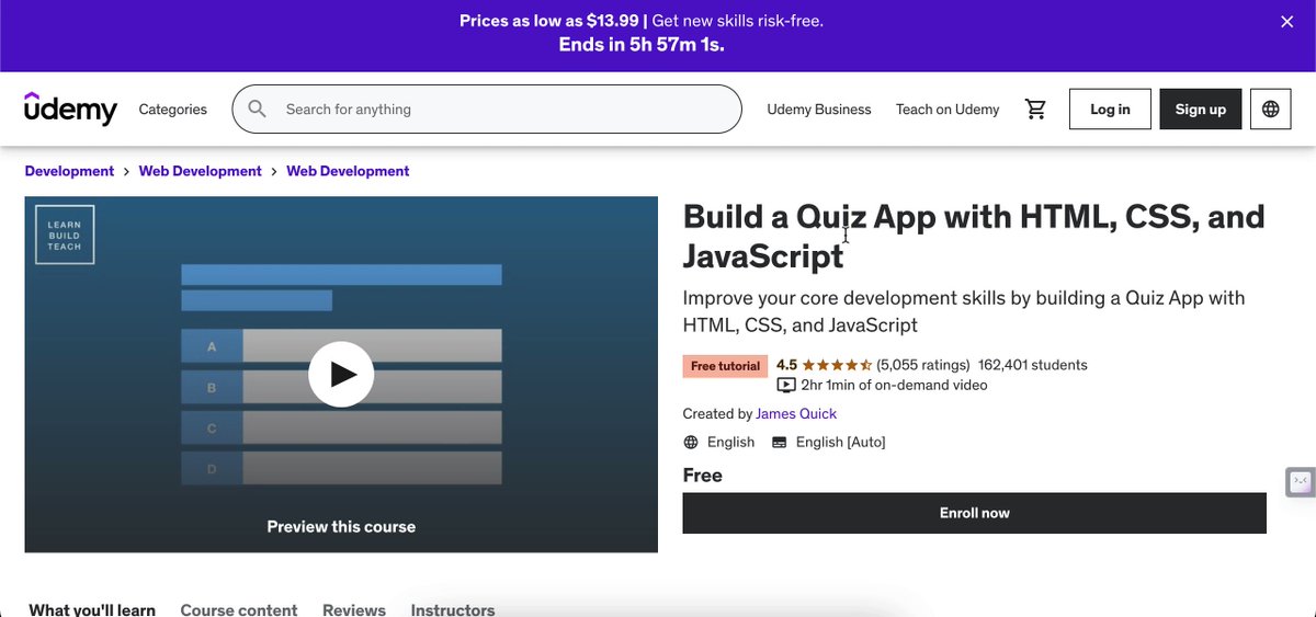 2. Build a Quiz App with HTML, CSS, and JavaScript ✓ ES6 JavaScript features like arrow functions, the spread operator, const and let, and template literal string ✓ how to use Flexbox, Animations, and REM units in CSS Link: udemy.com/course/build-a…