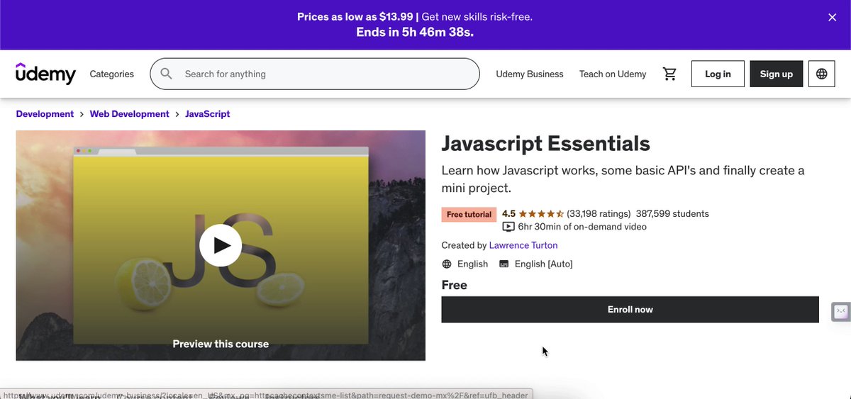 6. Javascript Essentials This course will help you: ✓ Learn what is a programming language and the basic concepts for beginners. ✓ Know the basic syntax of Javascript. ✓ Know some hidden quirks in Javascript. Link: udemy.com/course/javascr…