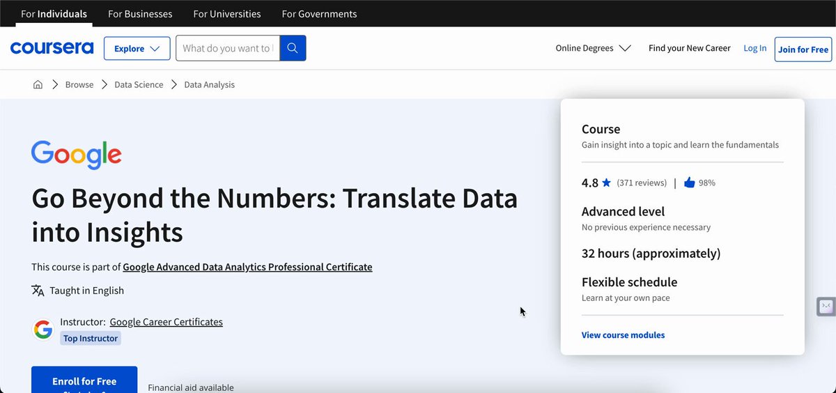 10. Go Beyond the Numbers: Translate Data into Insights In this course, you’ll learn how to find the story within data and tell that story in a compelling way. 🔗 lnkd.in/gtkbrfBB