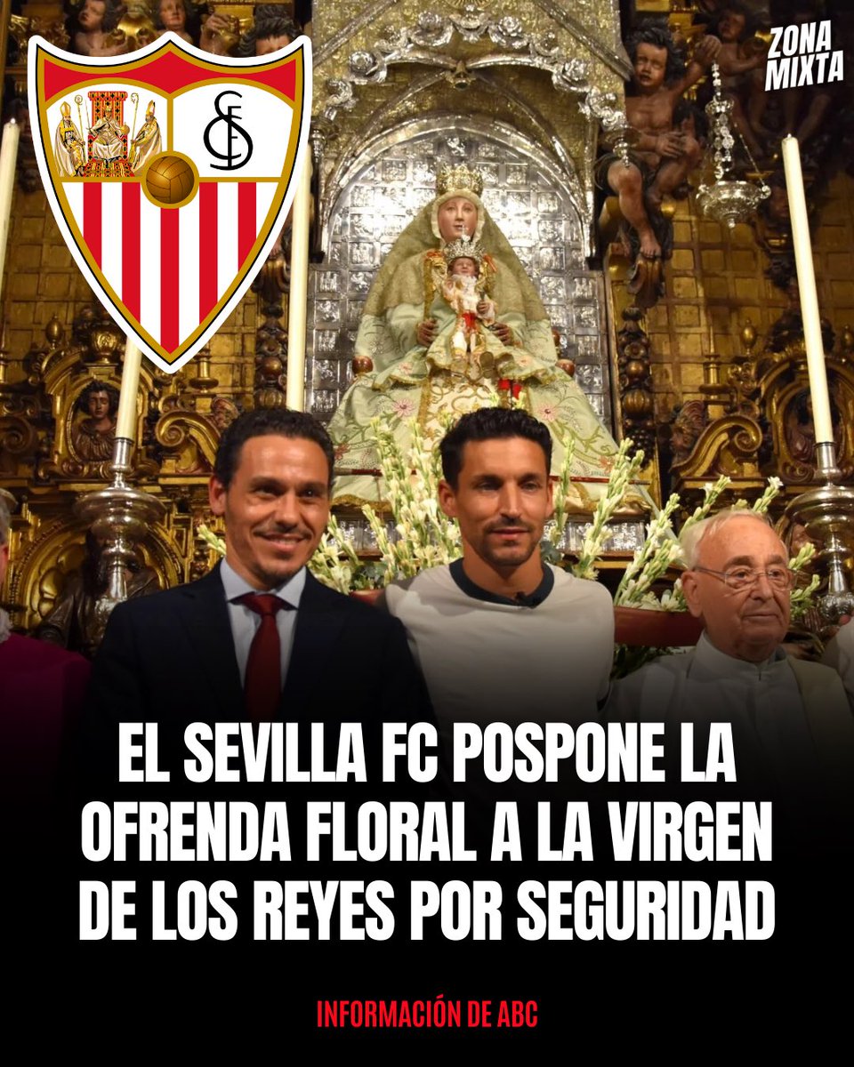 🚨⚪️🔴 ¡ÚLTIMA HORA! ❗️ El @SevillaFC pospone la ofrenda floral a la Virgen de los Reyes por motivos de seguridad, según ha informado ABC. 📌 Ha decidido realizarla en el mes de septiembre. #ZonaMixta