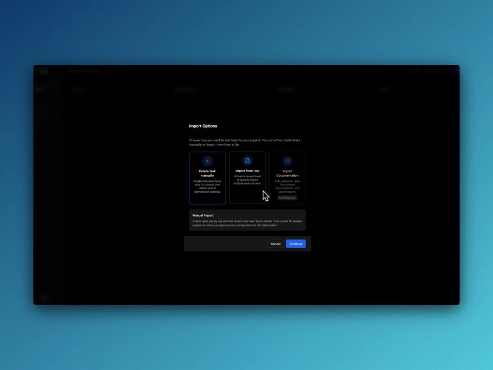 How CodeRide works: 1️⃣ IMPORT: Upload your task list manually or via CSV