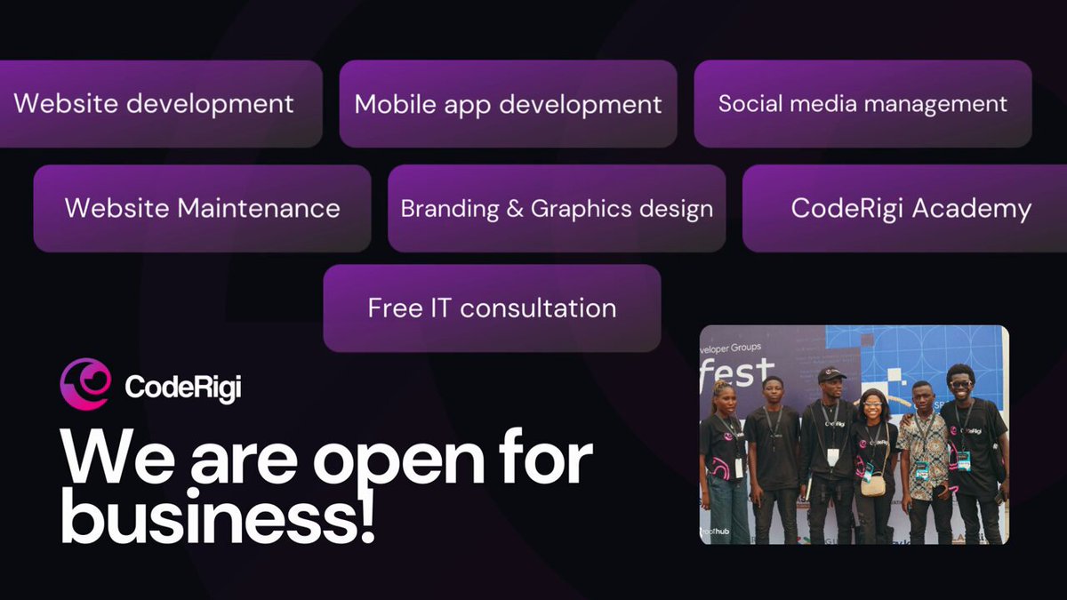 Kindly visit our office, place a call across to us, or send us a DM or email to get started on your pending projects. P.S. We also offer free consultation services to help guide you on the steps required for your project. #coderigi #backtowork #techcompany #ITservices #booknow