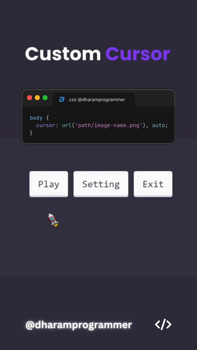 Cursor with Custom Images in CSS! Follow @dharamprogrammer for more coding Tips and Tricks! Tags:- #WebDevelopment #CSS #CustomCursor #FrontendDevelopment #WebDesign #CodingTips #WebDevCommunity #HTML #CSSHacks #LearnToCode #ProgrammerLife #TechTutorial #WebDesigner #CodeNewbie