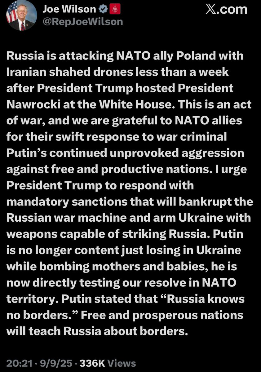 European Parliament’s double standards: Putin and Netanyahu both wage wars — yet Russia is condemned, Israel backed by NATO & EU. Joe Wilson -“Russia hitting Poland with Iranian drones.” Same day Ursula gives her ‘State of the Union’ for more war & MIC spending—convenint Timing.