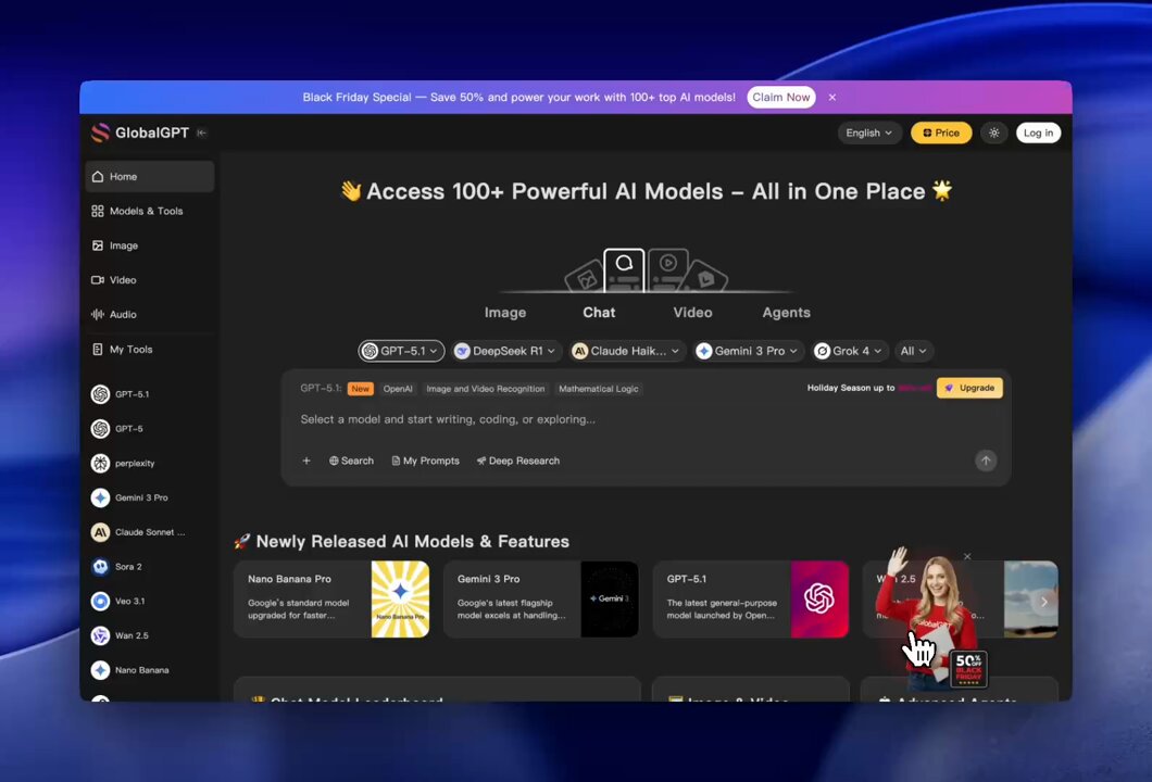 AI #BlackFriday Deals are live! → 1 account, use anywhere, no limits. → Access 100+ cutting-edge AI models — official APIs guaranteed. → Generate videos, images, reports, and boost your work, study, or research. → Up to 50% off for a limited time, only on GlobalGPT. 👉…