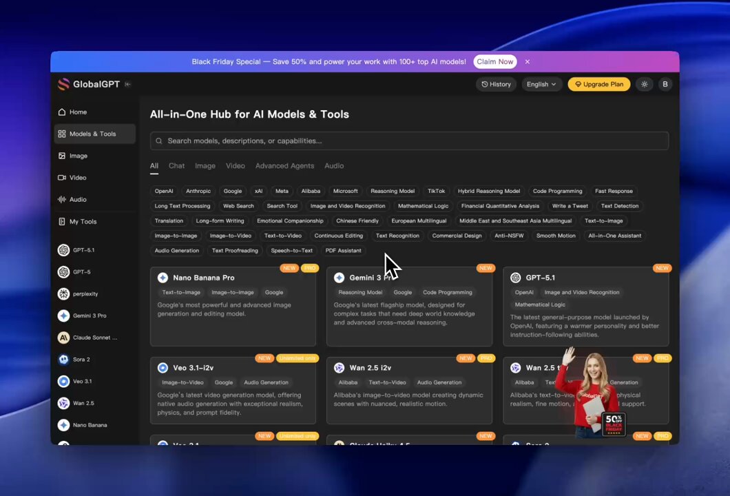 AI #BlackFriday Deals are live! → 1 account, use anywhere, no limits. → Access 100+ cutting-edge AI models — official APIs guaranteed. → Generate videos, images, reports, and boost your work, study, or research. → Up to 50% off for a limited time, only on GlobalGPT. 👉…
