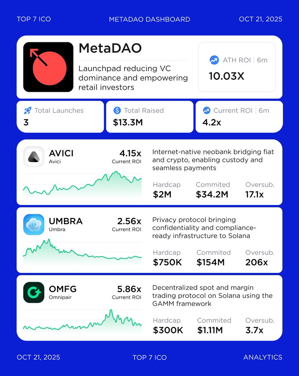 MetaDAO Dashboard - New Unlock Mechanism @MetaDAOProject is a decentralized launchpad designed to reduce VC dominance and empower retail investors. It has raised $13.3M across 3 token launches with an ATH ROI of 10.03x. The latest project, @AviciMoney, introduced a unique unlock…