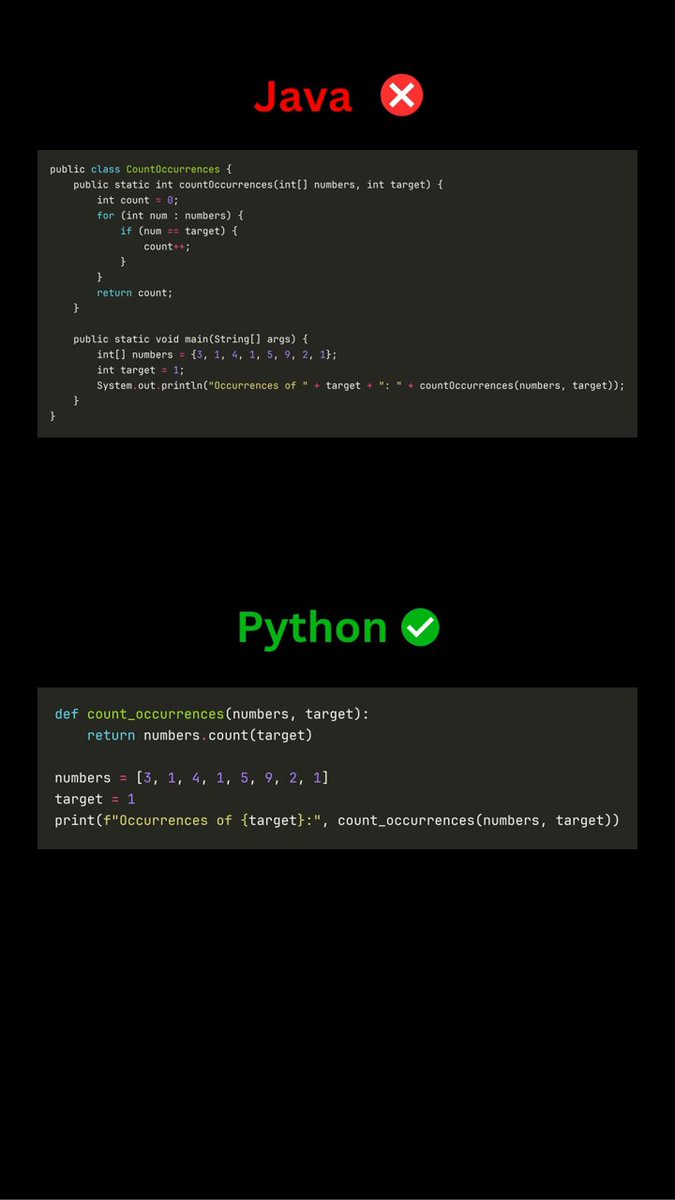 Java vs Python: Counting Element Occurrences #SmallAlgorithmComparison Count occurrences of an element in a list or array with Python and Java. Quick and simple solutions! #Java #Python #pythoncoding4u #codeaj