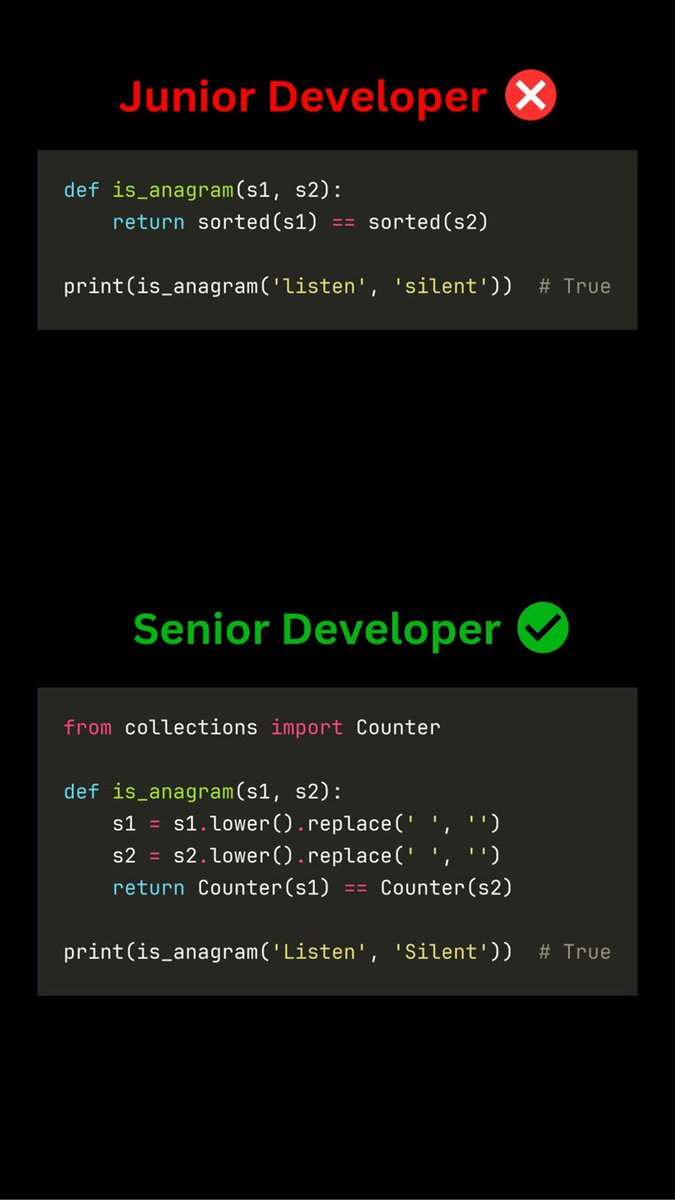 Python Anagram Check: Junior vs Senior Style #CodingTips Which anagram implementation is better? Sorted vs Counter approaches! #Python #AlgorithmComparison #Programming #pythoncoding4u #codeaj