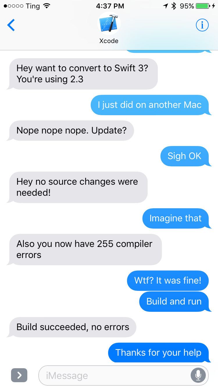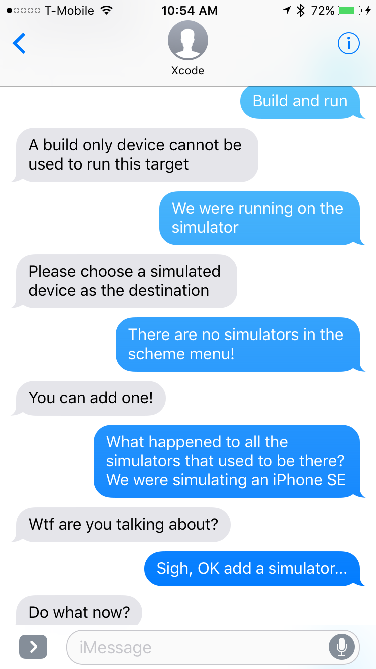 txt from Xcode: Xcode: BUILD SUCCESSFULLY! HOORAY! Xcode: also 1 error me: the fuck… would you make up ur mind already -___-