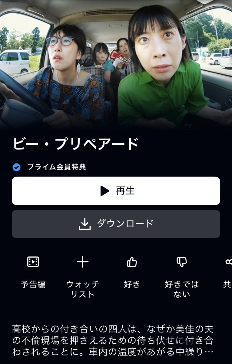 ビー・プリペアード SAMANSA ショート 15分 友達の夫の浮気現場を押さえるために車で待ち伏せて…って話。 ゆるいテンポでラストまで駆け抜けてくれる会話劇。めっちゃ好きで隙間時間につい何回も観ちゃう。 映画を観て笑いたい人にオススメです。