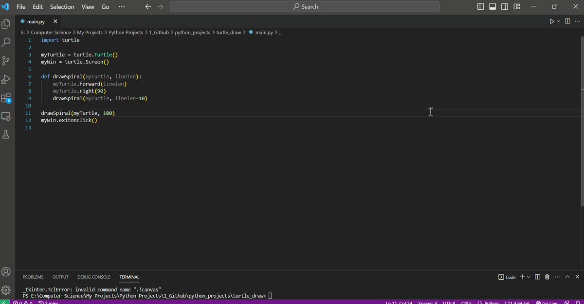 Project 13 - Turtle Draw ๐ข After a break, I came back with a basic python program using turtle module to draw a spiral. ๐ #100ProjectsOfPython