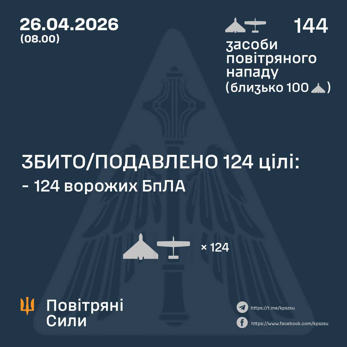 У ніч на 26 квітня (з 18:00 25 квітня) противник атакував 144 ударними БпЛА. ⚡️ ЗБИТО/ПОДАВЛЕНО 124 ВОРОЖИХ БПЛА. Зафіксовано влучання 19 ударних БпЛА на 11 локаціях, а також падіння збитих (уламки) на 6 локаціях.