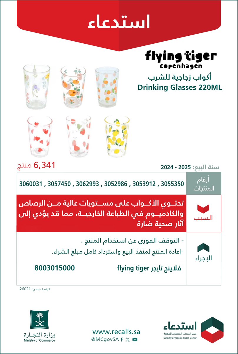لسلامتكم .. ‼️ (ندعوكم إلى التوقف الفوري عن استخدام المنتج وإعادته لمنفذ البيع واسترداد كامل مبلغ الشراء) نعلن عن #استدعاء "flying tiger" 6,341 أكواب زجاجية للشرب 220 مل 🗓 2024 - 2025 🔍 أرقام المنتجات: 3060031 3057450 3062993 3052986 3053912 3055350 🔻 بسبب احتواء الأكواب
