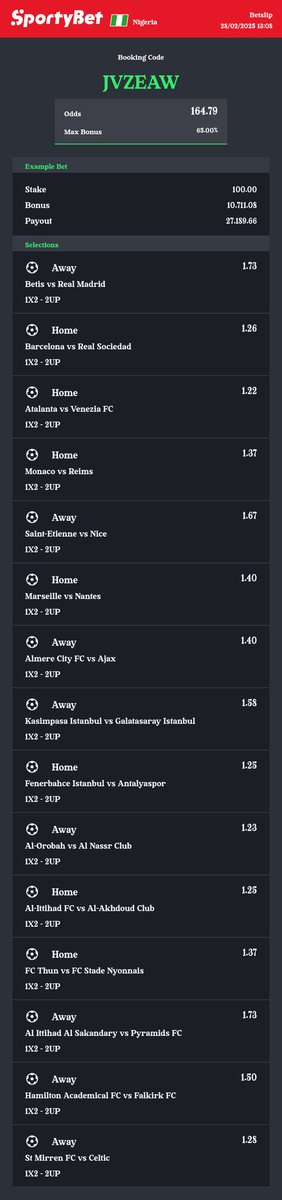 MEGA 2UP BOOKING CODE FOR SUNDAY ๐ฅ 129.58 ODDS ๐ฅ ๐ Start Time: Sunday ๐ณ๐ฌ 637151 - sportybet.com/?shareCode=637โฆ ๐ฌ๐ญ 637151 - sportybet.com/?shareCode=001โฆ ๐น๐ฟ 637151 - sportybet.com/?shareCode=001โฆ Get ready to secure the bag! ๐ฐ #BetSporty #2Up