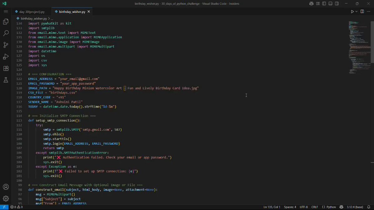 🥳 Day 29 of #30DaysofPython Challenge by IDC! 🎉 Let Python handle the birthdays so you can enjoy the cake! 🎂💻 I built an Automatic Birthday Wisher that sends: 📧 Emails 📱 WhatsApp messages 📅 Reads CSV ⏰ Runs daily via scheduler #IDC30DaysChallenge