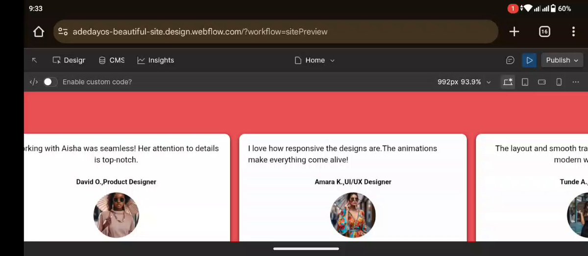 Day 3 of #30DaysOfWebflow journey I built an infinite testimonial loop today - inspired by what I learned from Timothy Ricks Finally getting comfortable with Flexbox too 💪 It took patience, but seeing everything move smoothly feels so rewarding ✨ Feedback is always welcome!