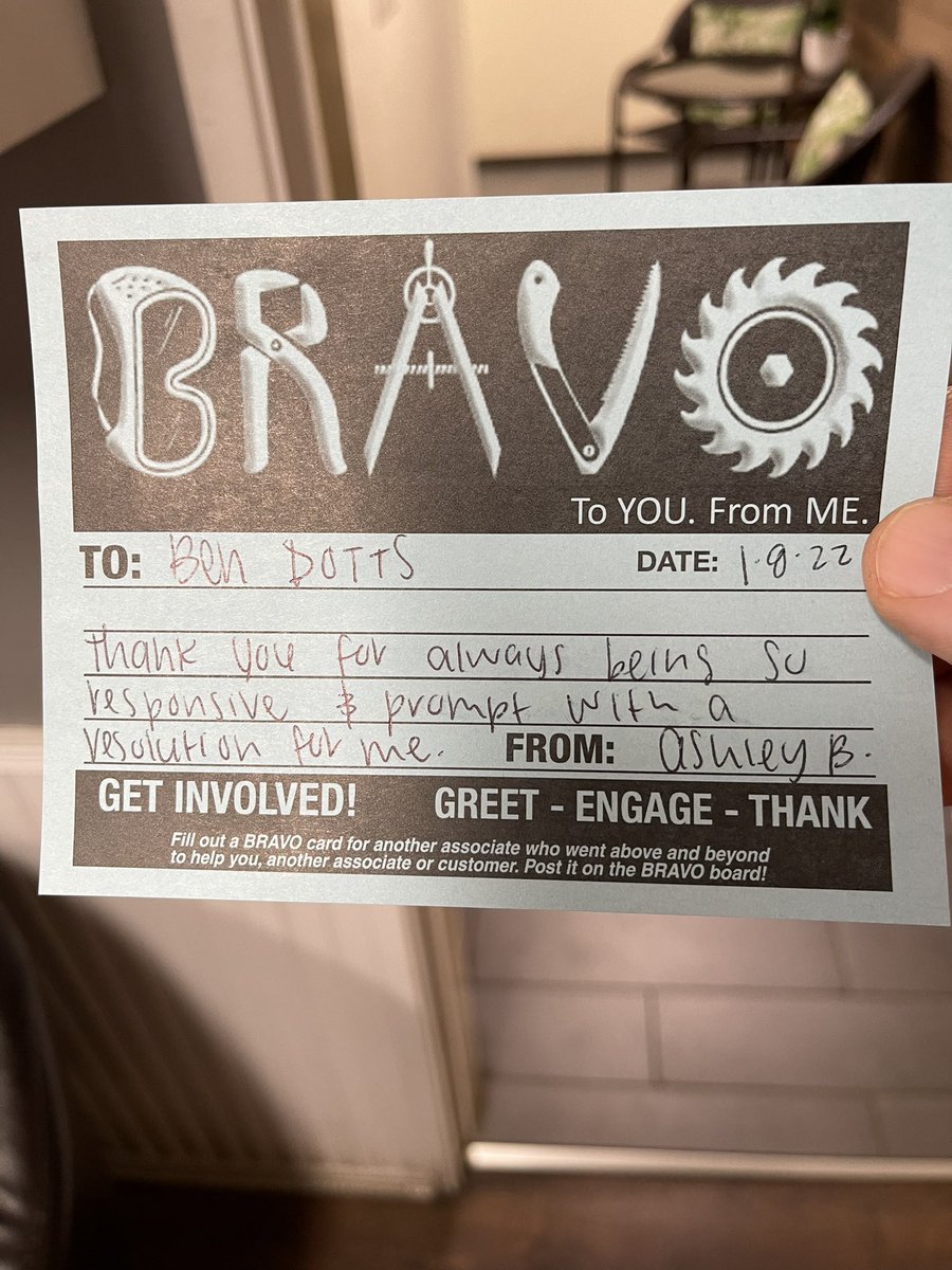 Pete in D23 cut some carpet for me. I wrote him a Bravo. When I walked up to present it, he thought I was bringing him more work! Thanks, Pete.... More work next time. @RLM4040 @cayselahrman @FroFroAtDepot #4040rocks
