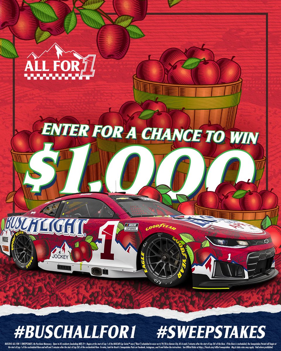 LAP 41 and your chance to win $1,000 is NOW! Reply using #BuschAllFor1 #Sweepstakes to enter for a chance to win! #AdventHealth400 @kansasspeedway