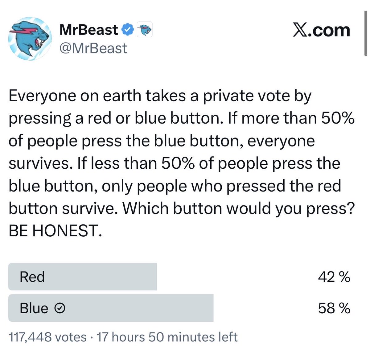Everyone on earth takes a private vote by pressing a red or blue button. If more than 50% of people press the blue button, everyone survives. If less than 50% of people press the blue button, only people who pressed the red button survive. Which button would you press? BE HONEST.