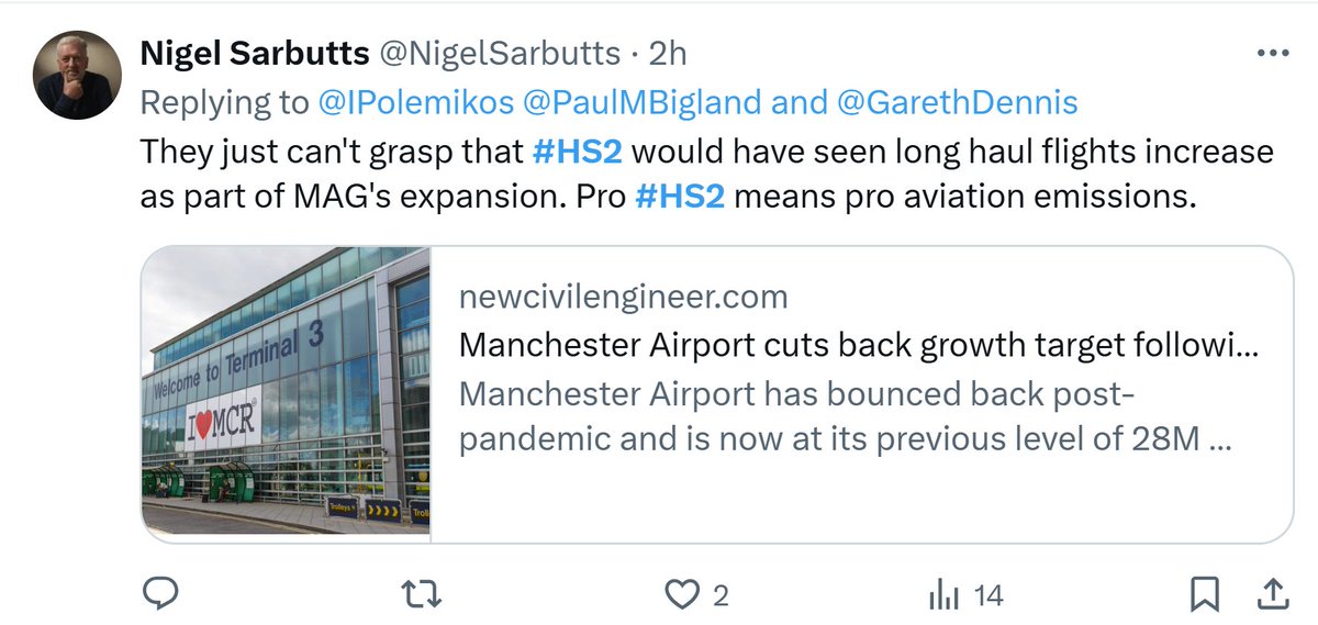 There's nothing more intellectually bankrupt than people claiming we shouldn't build low carbon mass public transport because some people will use it to get to airports (rather than driving). But that's a #5thratePR for you. #hs2 #stophs2isdead