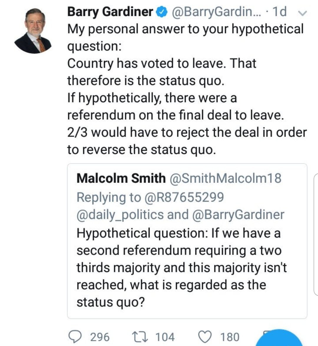 If Labour got a majority, would Gardiners referendum parameters apply though? A two thirds majority needed for remain? These details are critical to know before remainers 'lend' a Corbyn Labour party their vote again. Remember the #6Tests.