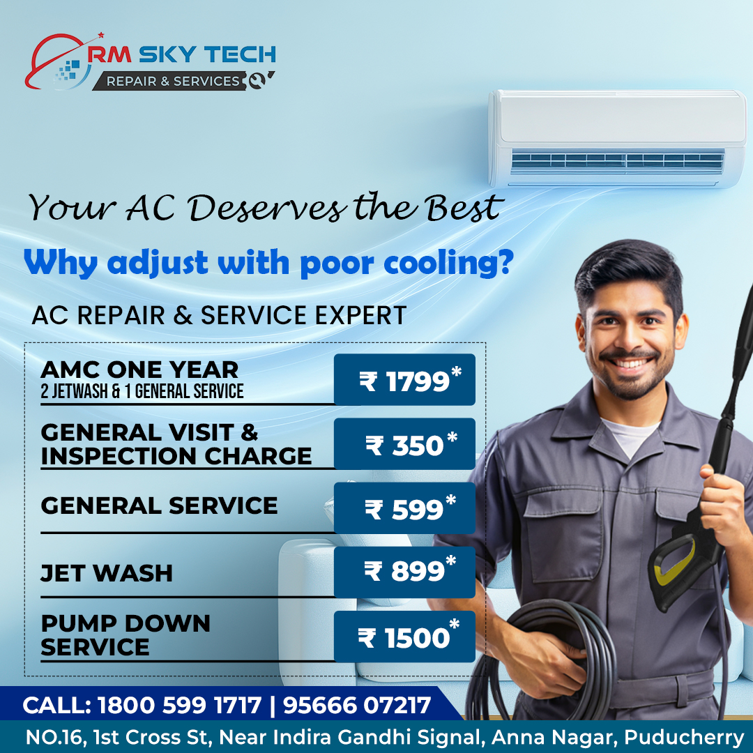 Your AC deserves the best care! ❄️ With RM Sky Tech, you get reliable AC repair and service from the experts. Our comprehensive services, from a Jet Wash to a yearly AMC, ensure your AC runs efficiently and keeps you comfortable all year long. #ACServiceExpert #ACRepairExpert