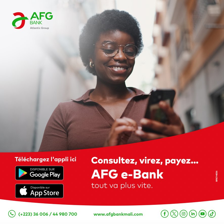 📱 Avec AFG eBank, Djorô Bana ! Simplifiez votre quotidien en gérant vos transactions et en surveillant votre argent en toute sécurité, où que vous soyez. 📲 urlz.fr/m5BE 📲 urlz.fr/rcOJ #AFGBankMali #BanqueMobile #AFGeBank