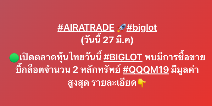 #AIRATRADE 🚀#biglot (27 มี.ค.) 🔴ปิดตลาดหุ้นไทยเช้าวันนี้ มีการซื้อขายบิ๊กล็อต 3 หลักทรัพย์ #QQQM19 มีมูลค่าสูงสุด 500.68 ลบ. ราคาเฉลี่ยหุ้นละ 15.48 บาท มีรายการ ดังนี้👇 #BIGLOTวันนี้ #AIRA