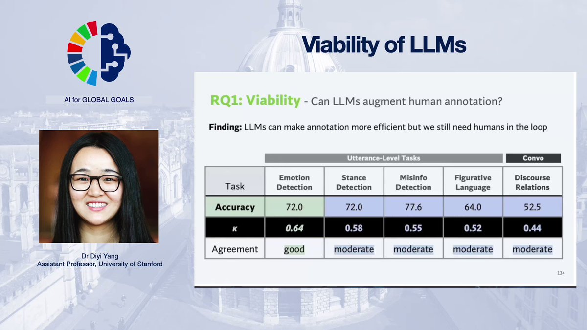 Dr. Diyi Yang (@Diyi_Yang) dives into the role of LLMs in annotation! They're great for some tasks, but can they replace human judgment? Spoiler: Not yet. But combining AI & humans? That's promising! 🔍🤖 #AIinAnnotation #HumanPlusMachine #StanfordAI #SDGs #AI4GG