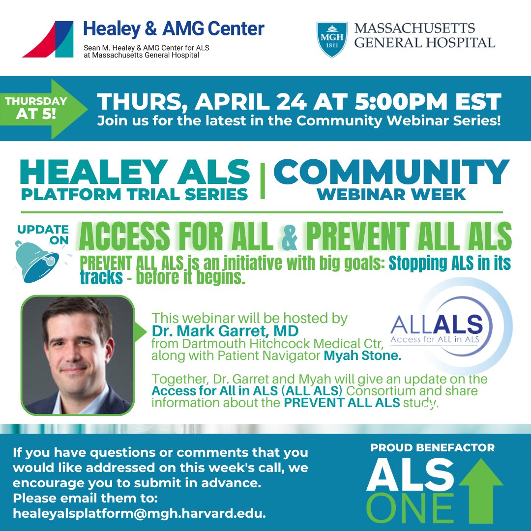 Join this Thurs, 4/24 5pm EST for the next Healey #ALSPlatformTrial Commun Webinar where Dr. Mark Garret from @DHMCandClinics along w/Patient Nav. Myah Stone, will give an update on the Access for All in #ALS (#AllALS) Consort & share info on #PreventALS bit.ly/3KKsme2.