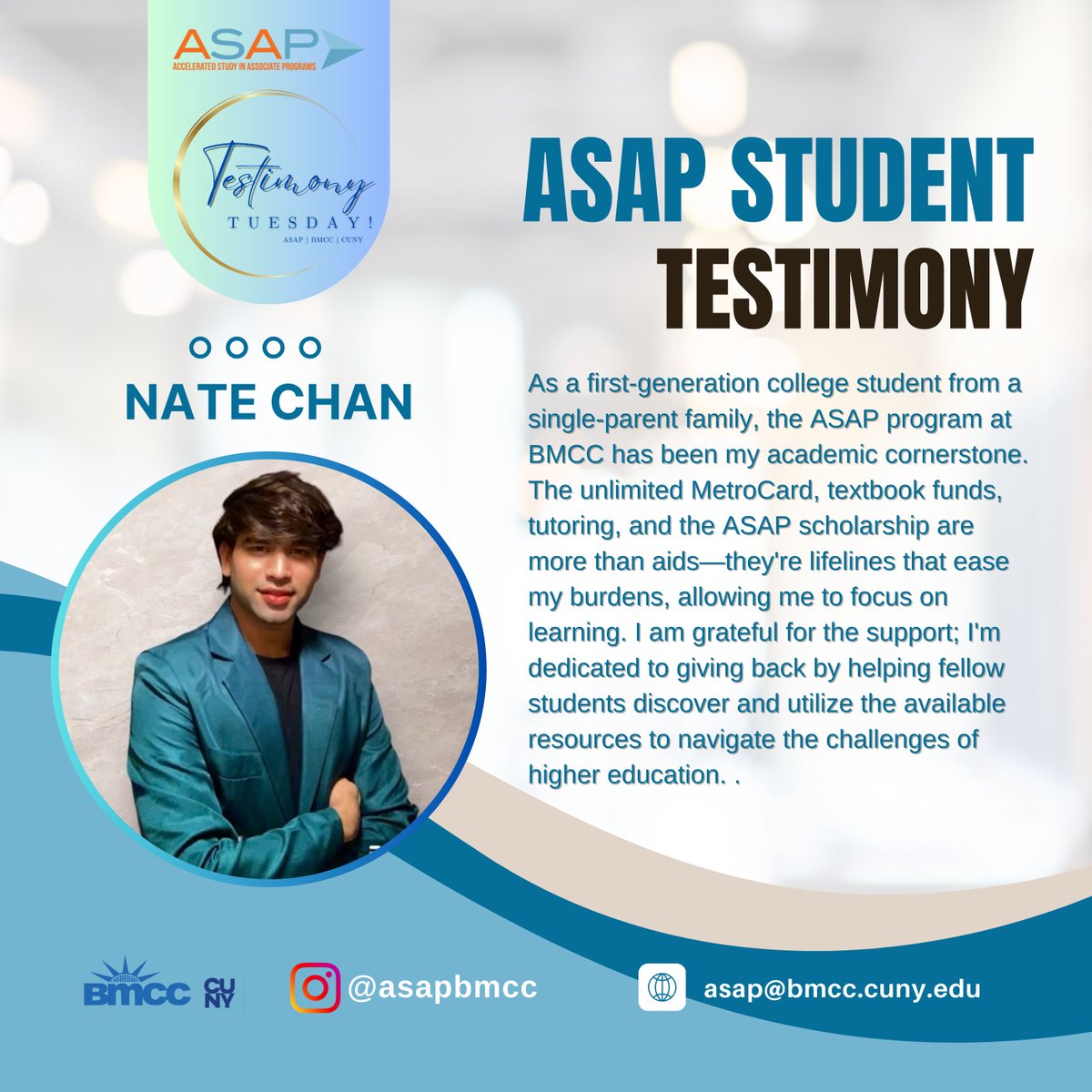 It’s Testimony Tuesdaaaaay! Read how the ASAP Success Program at BMCC has benefited another incredible student – Meet ASAP Member, Nate Chan. Every week, we highlight an outstanding ASAP student. #TuesdayTestimony #ASAPBMCC #BMCC #CUNY #Testimonial
