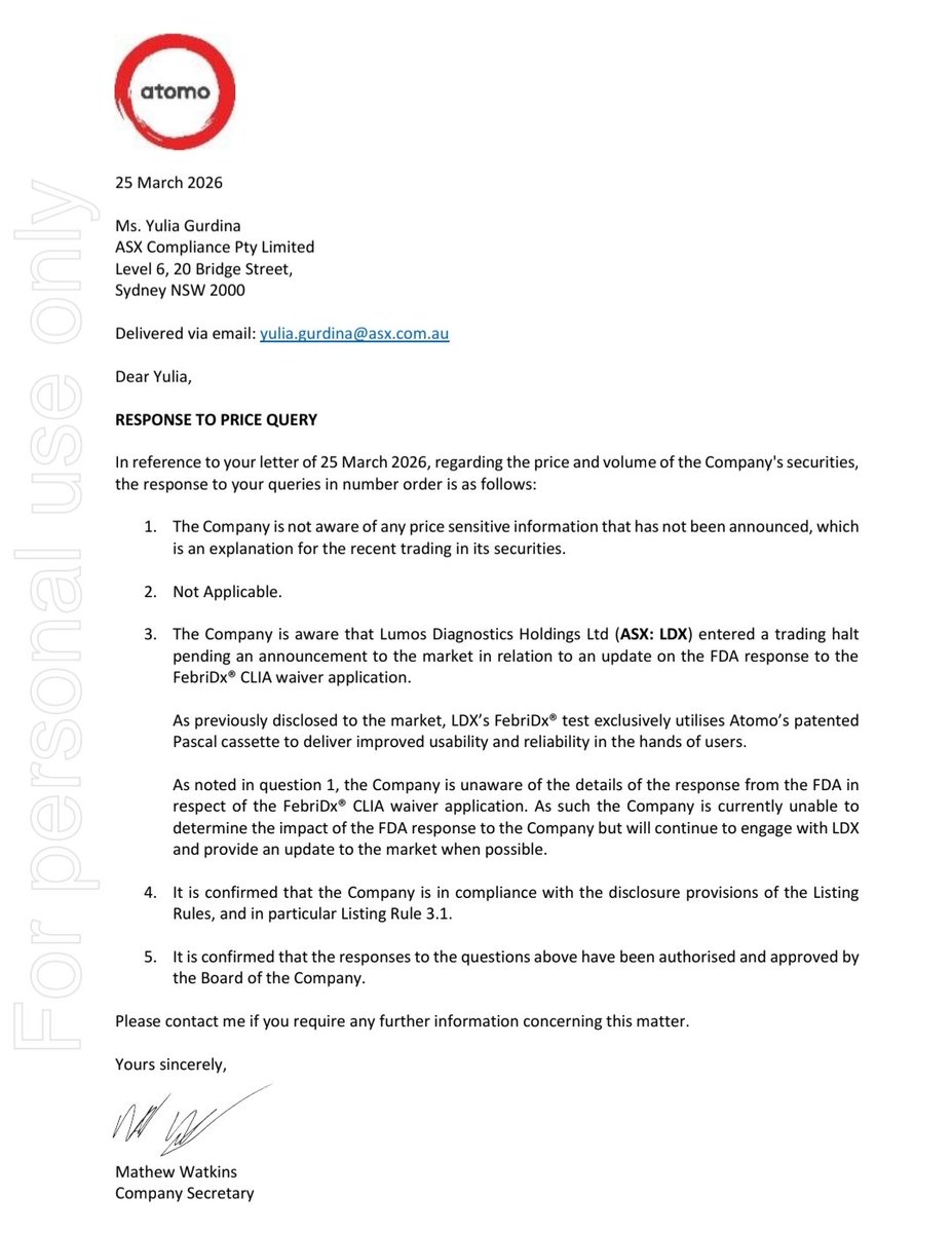 ATOMO DIAGNOSTICS LIMITED ( #AT1 ) has released " Pause in Trading " on Thu 26 Mar at 9:55 am AEST #ASX