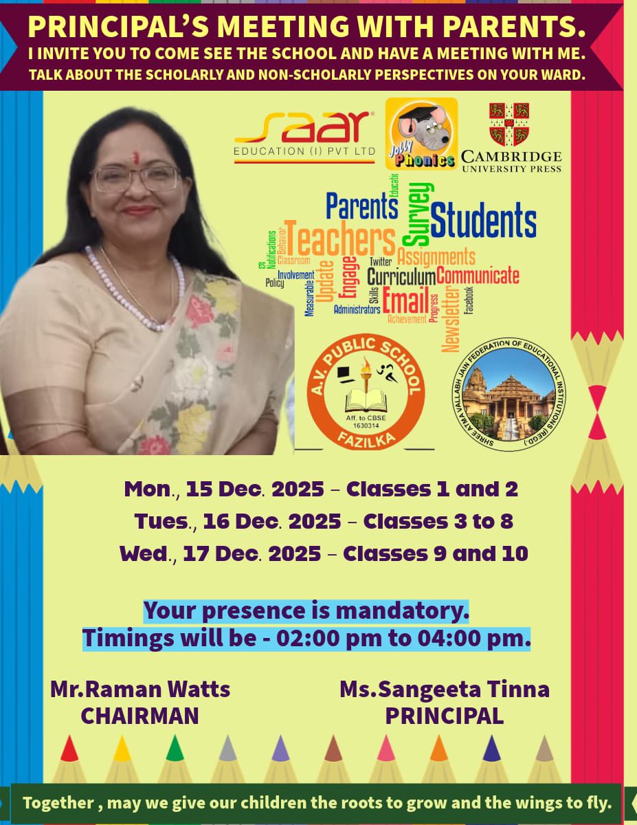 📣 Important PTM Schedule at AVPS Fazilka! . 🗓️ Dec 15: Classes 1 & 2 🗓️ Dec 16: Classes 3 to 8 🗓️ Dec 17: Classes 9 & 10 ⏰ Timings: 02:00 PM - 04:00 PM Also, mark your calendar for the All Blooms PTM on Dec 20, 2025, from 2-4 PM! #AVPS #ParentTeacherMeeting #SchoolNews