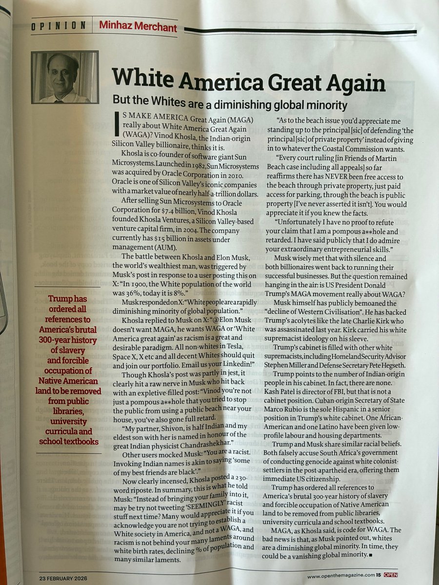 #MAGA (Make America Great Again) is really #about #WAGA (White America Great Again), says Silicon Valley billionaire #VinodKhosla. In a bitter exchange on X, Elon Musk called Khosla an a**hole but didn’t refute Khosla’s point: MAGA is deeply racist. My @Openthemag column