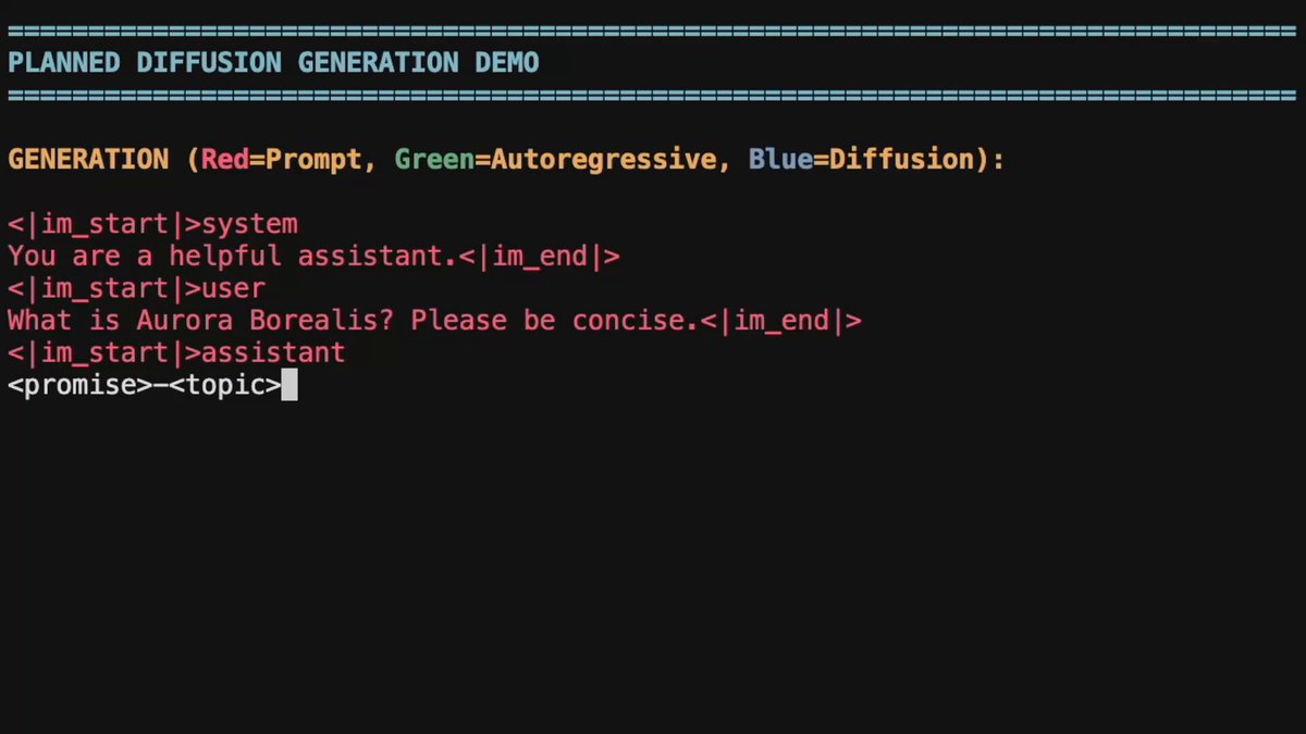 "An hour of planning can save you 10 hours of doing." โจ๐ Planned Diffusion ๐ โจ makes a plan before parallel dLLM generation. Planned Diffusion runs 1.2-1.8ร faster than autoregressive and an order of magnitude faster than diffusion, while staying within 0.9โ5% AR quality.