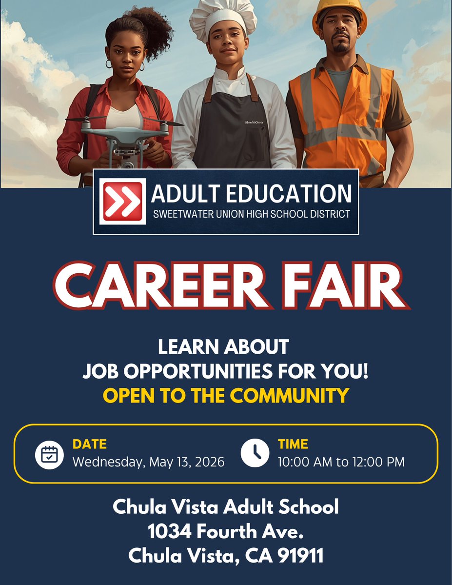 SAVE THE DATE! Join us for a free career fair. Open to the public. We will be showcasing our free career training courses as well. Location: Chula Vista Adult School When: Wednesday, May 13, 2026 Time: 10am to 12pm #AdultEducation #AdultEdu #AdultEd #SUHSDAdultEd