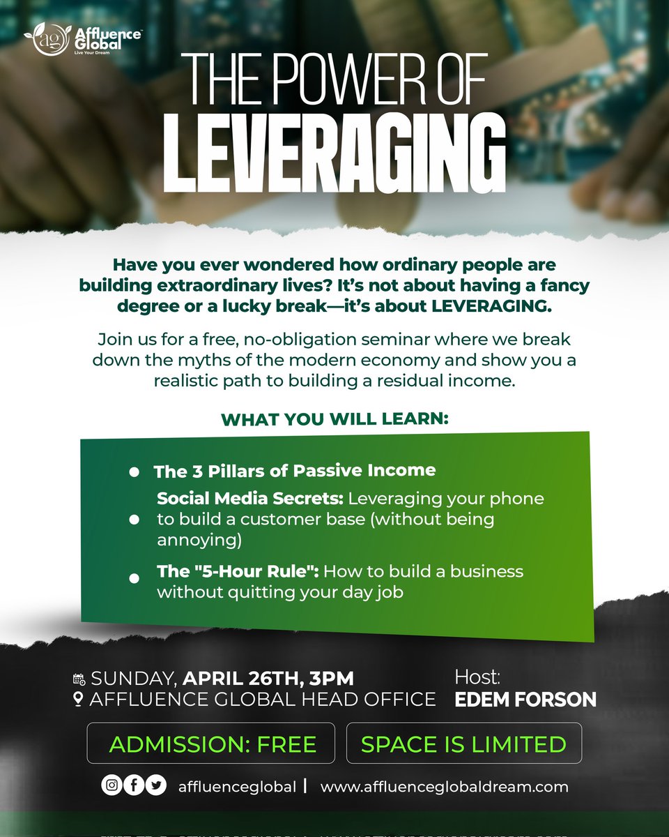 Your next level wonโt happen by chance โ it happens by design. This is more than a masterclass. Itโs a blueprint for affluence. Join us this sunday at Affluence Global office Kumasi #AffluenceGlobal #WealthCreation #BusinessGrowth #PersonalDevelopment